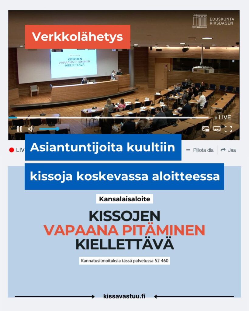 Perjantaina 24.10.2025 klo 9 Maa- ja metsätalousvaliokunta järjesti julkisen kuulemisen koskien kansalaisaloitettamme “Kissojen vapaana pitäminen kiellettävä”.